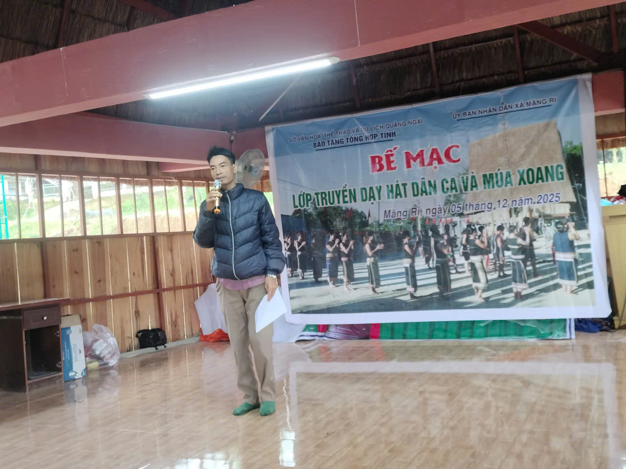 Sáng ngày 05/12/2025, tại Nhà rông văn hóa thôn Đăk Song, UBND xã Măng Ri phối hợp với Bảo tàng Tổng hợp tỉnh Quảng Ngãi tổ chức Lễ bế mạc lớp truyền dạy hát dân ca và múa xoang dành cho cộng đồng dân tộc Xơ Đăng trên địa bàn xã. Đây là hoạt động thuộc Dự án 6 – Chương trình mục tiêu quốc gia phát triển kinh tế – xã hội vùng đồng bào dân tộc thiểu số và miền núi năm 2025, nhằm phục hồi, gìn giữ và lan tỏa các giá trị văn hóa đặc sắc của dân tộc Xơ Đăng.